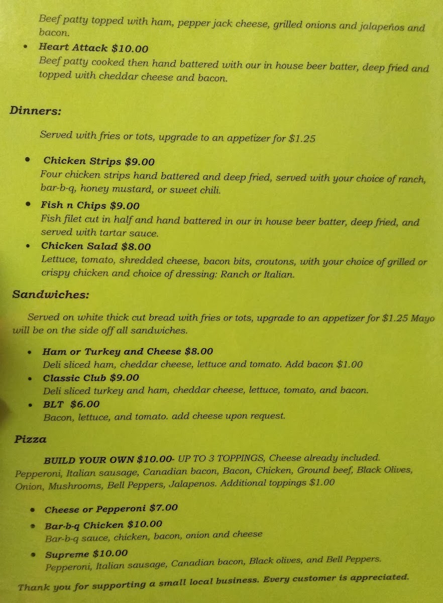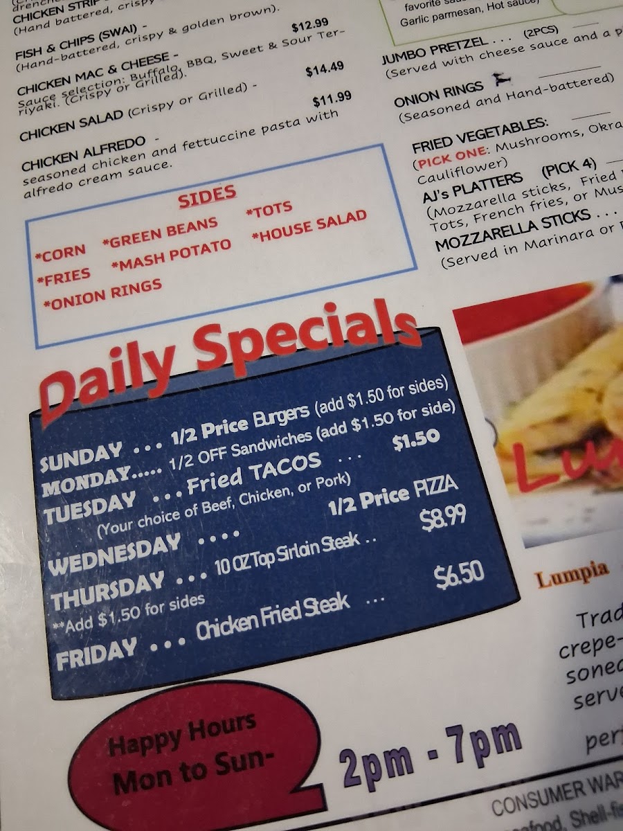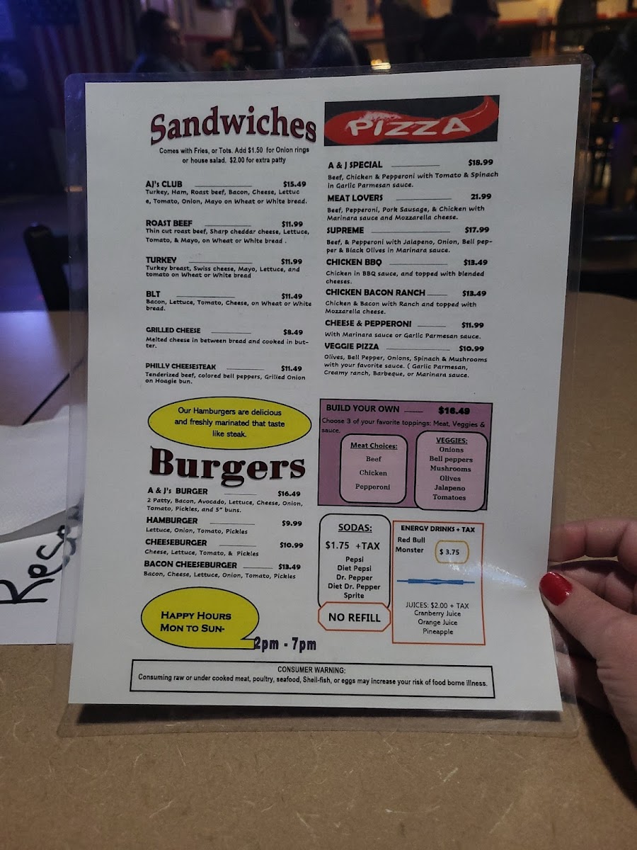 At A & J's Music Room, located at 1602 S Meridian Ave, Wichita, KS 67213, we invite you to embark on a delicious journey through our diverse and exciting menu. Whether you're craving comfort food or looking to explore innovative flavors, our specialties are sure to hit all the right notes. Dive into our tender Chicken Fried Steak or indulge in our signature Supreme Pizza, perfect for sharing with friends. Don't miss the chance to savor our BBQ Chicken Pizza or the juicy AJ Burger paired with crispy Tater Tots for the ultimate treat. For something refreshing, try our flavorful Pho or the classic Cheeseburger and Fries. With exciting options like the Donut Burger, Chipotle Chicken Sandwich, and hearty Steak and Asparagus, we guarantee a delightful experience in every bite. So gather your friends, enjoy some great tunes, and let your taste buds dance at A & J's Music Room!